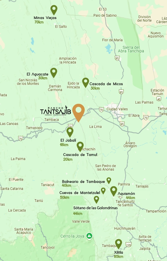 Nos encontramos en un punto estratégico para que conozcas los mejores parajes en tu viaje a la Huasteca Potosína. Nuestro Rancho además ofrece un entorno de paz y armonía alejado del bullicio y estrés de la ciudad.