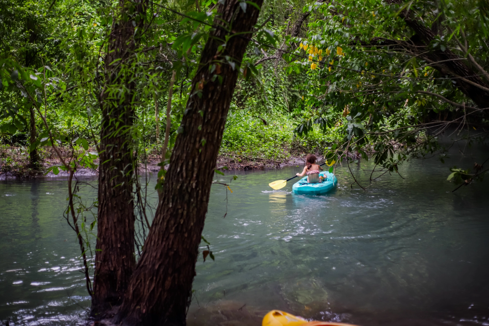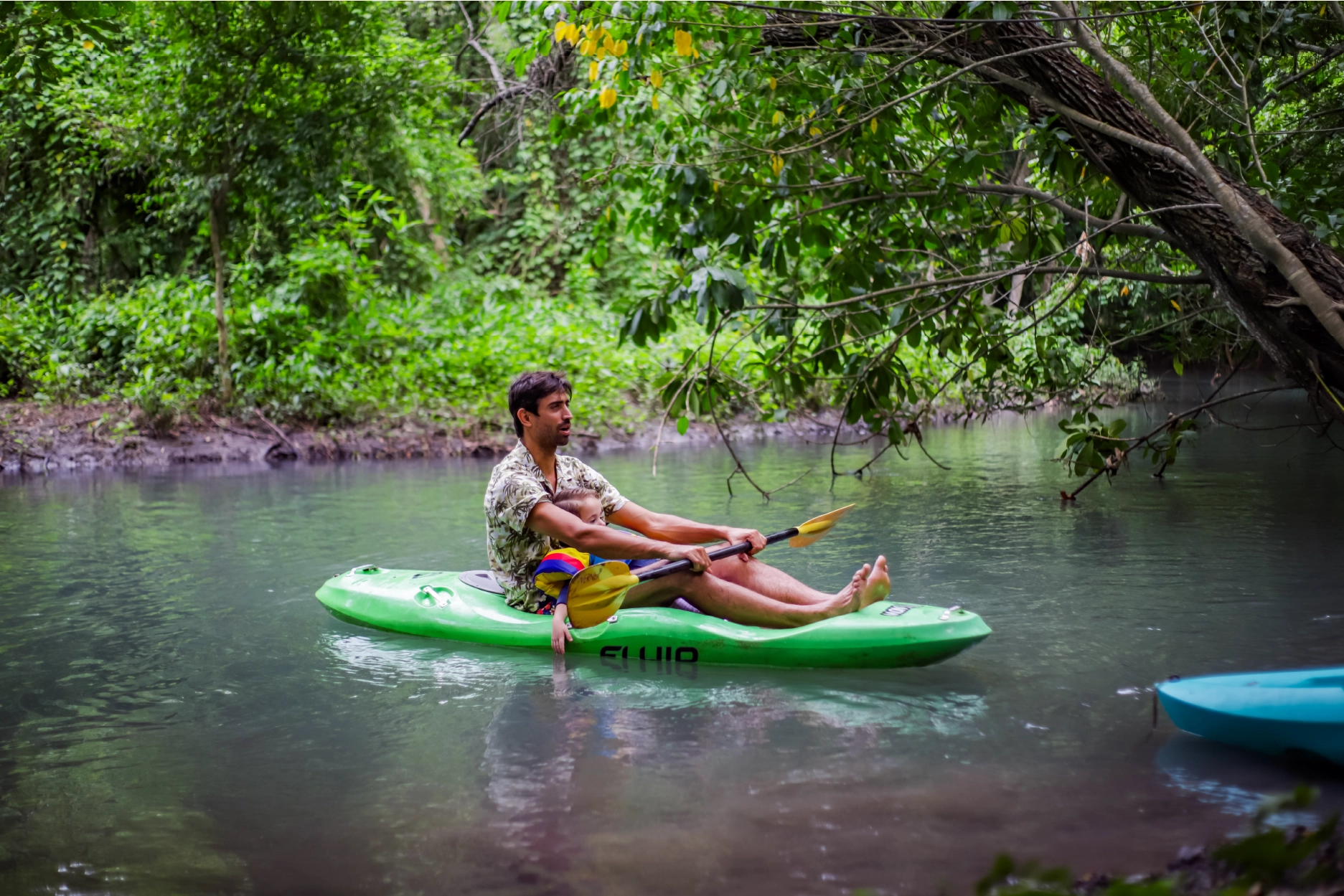 Dentro del Rancho contamos con kayaks para libre uso incluido. Disfruta de una remada en el río que cruza nuestras instalaciones.